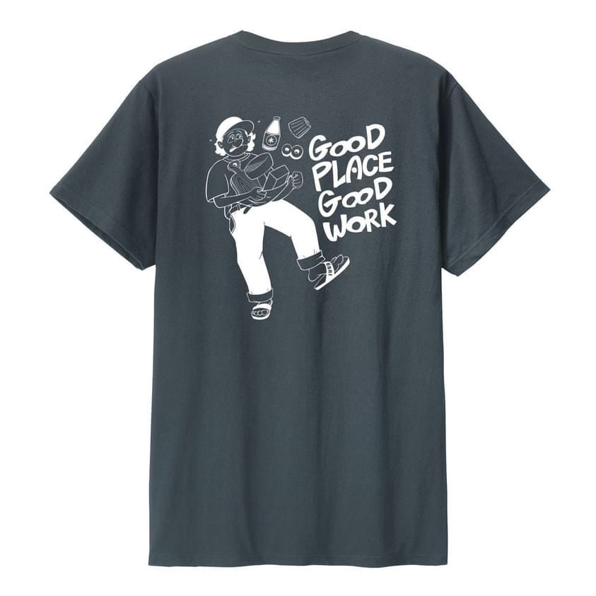 デザイナー雨池泰佑氏によるTシャツ WORK(デニム)。江別出身の彼が手がけたこのデザインは、ヒトモノコトが繋がる場所ЁBRIをテーマに表現されています。シンプルながら、わくわくする思いが込められた一枚です。