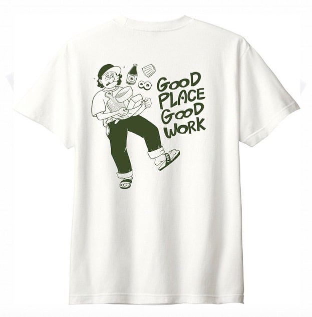 デザイナー雨池泰佑氏によるTシャツ WORK(アイボリー)。江別出身の彼が手がけたこのデザインは、ヒトモノコトが繋がる場所ЁBRIをテーマに表現されています。シンプルながら、わくわくする思いが込められた一枚です。